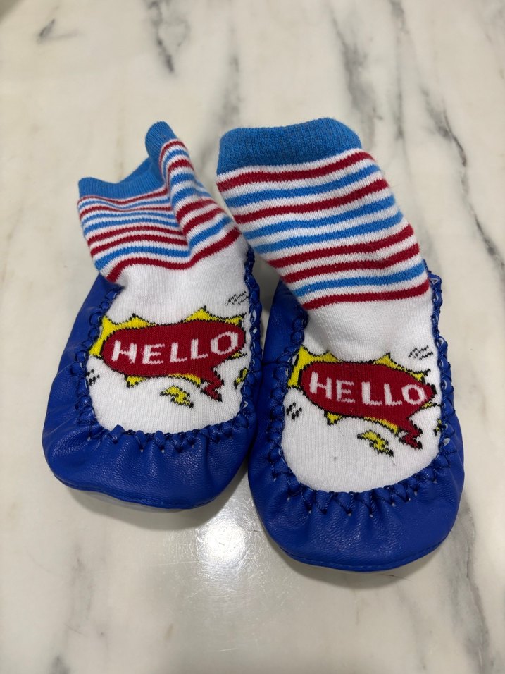 Bu erkek bebek ev ayakkabıları, renkli örgü üst kısmı ve pop kültür 'HELLO' baskısıyla, mavi kauçuk tabana sahiptir.