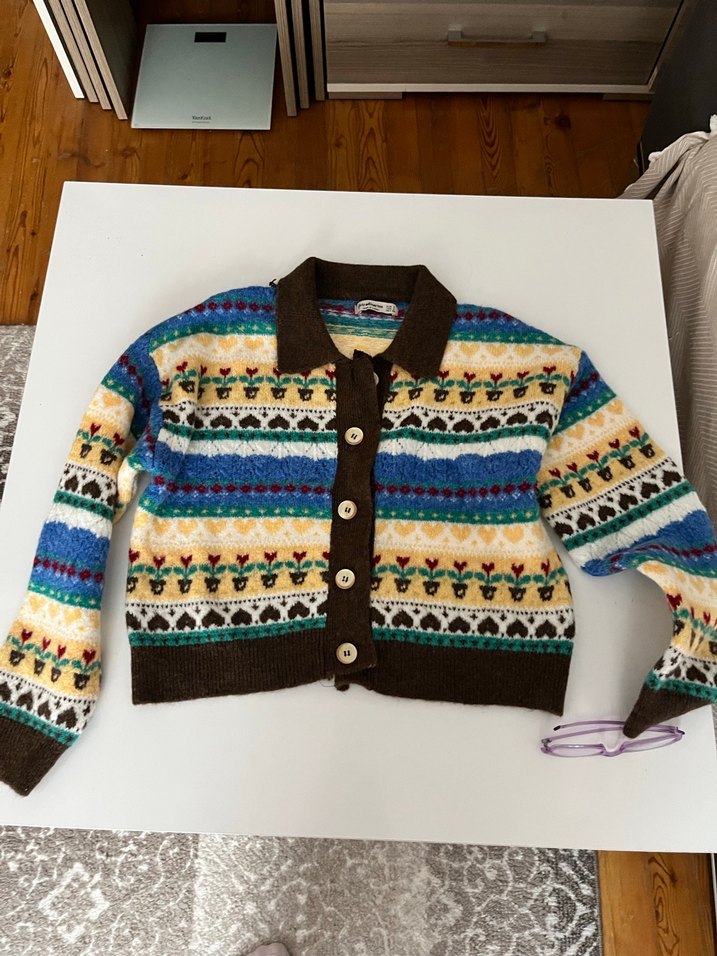 Örgü kumaştan, uzun kollu ve bol kesim erkek hırka. Koyu renkli çok renkli desenlere, düğmeli ön ve kontrast yakaya sahiptir. Hiç giymedim hediye gelmişti