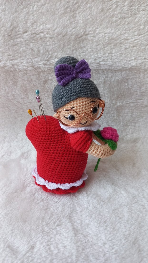Gri topuzlu, mor fiyonk detaylı, gözlüklü ve beyaz dantelli kırmızı elbiseli örgü bebek, iğne yastığı olarak kullanılır ve dikiş iğnelerini tutar.