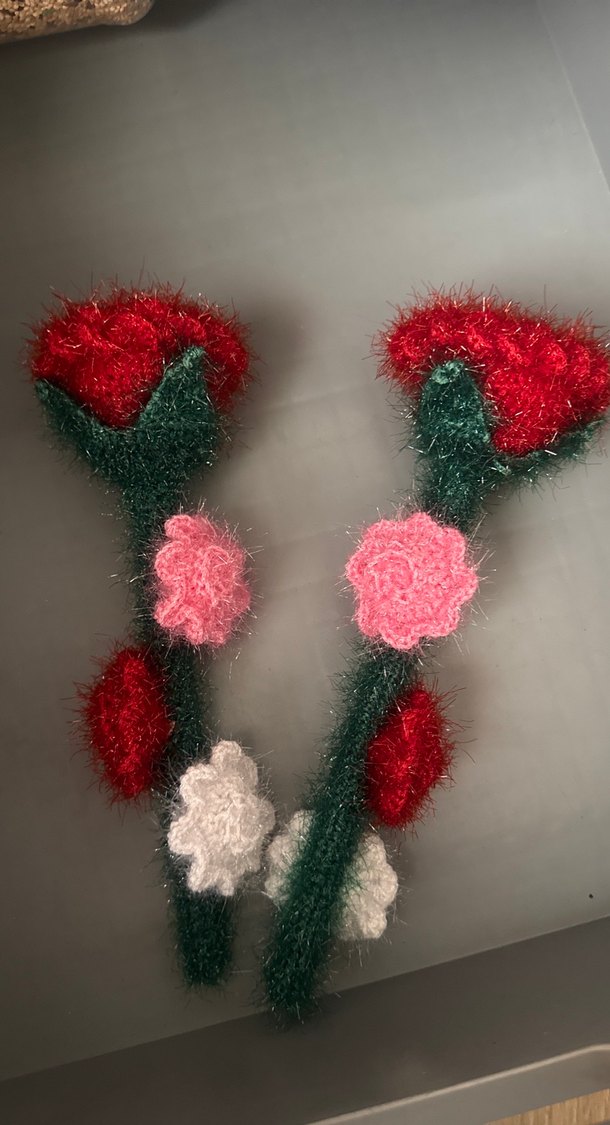Kırmızı, pembe ve beyaz örgü çiçeklerden oluşan renkli kadın saç aksesuarı. Yeşil saplarla bohem ve rahat bir tarz sunar. El işi örme gül