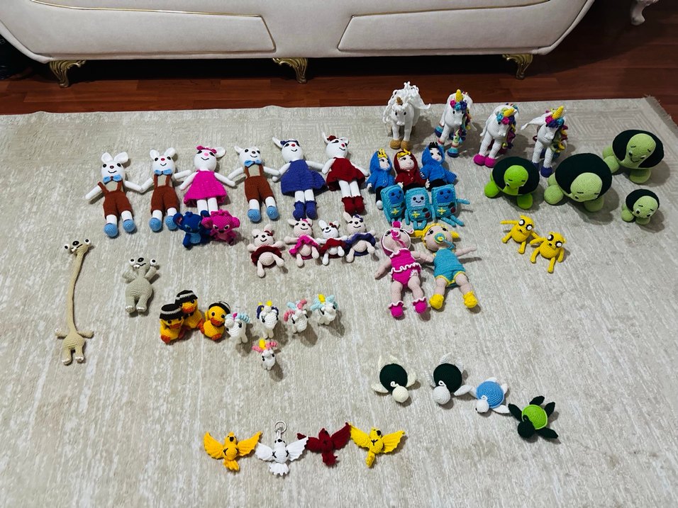 Yumuşak iplikten yapılmış renkli el örgüsü oyuncak bebekler, hayvanlar ve fantastik figürler seti. Amigrumiler fiyat ve sipariş alınır istediginizi söylemeniz yeterli