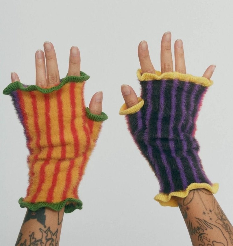 Canlı renklerde çizgili, örgü parmakları açık eldiven, fırfırlı kenarlarıyla avant-garde tarzını yansıtıyor.