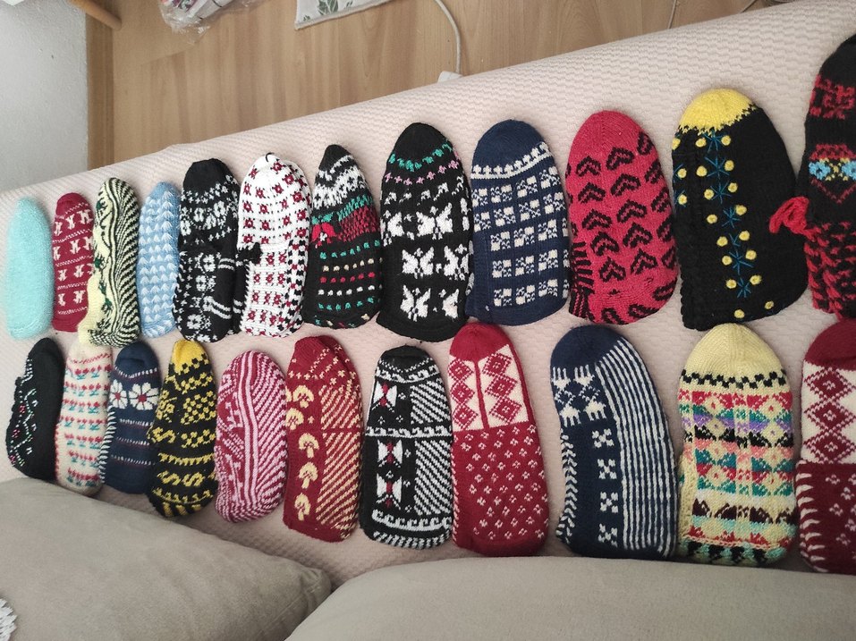 Çeşitli desenlere sahip renkli örgü patik Geleneksel tarzda, iç mekan için sıcak ve rahatlık sağlar. toplu olarak da verebilirim adet fiyatı 280 tl