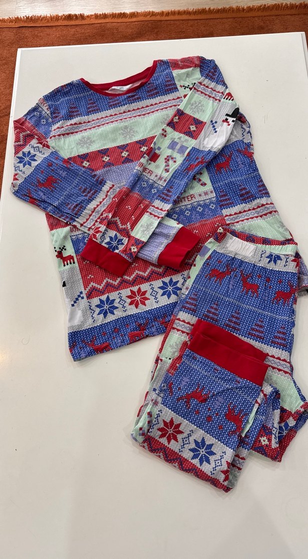 Renkli örgüden yapılmış, uzun kollu ve bisiklet yaka erkek pijama takımı. Bohem ve retro desenlerle rahat ve şık bir görünüm sunar. Normal boy üst ve midi boy pantolon içerir. Erkek çocuk içindir.