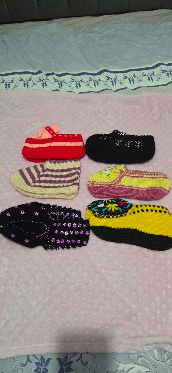 Renkli ve nakışlı desenlere sahip, örgü sıcak terlikler. Bohem ve retro tarzına uygun. çeyiz ürünüdür kullanılmadı hiç