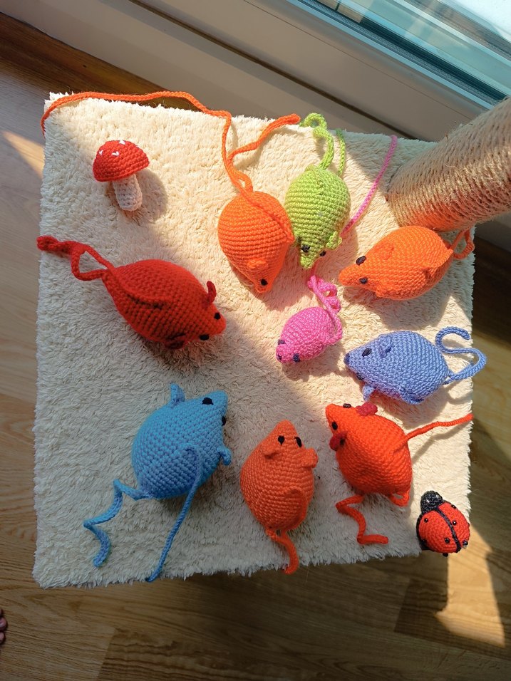 Çeşitli parlak renklerde renkli örgü fare ve böcek oyuncakları, oyun veya dekorasyon için uygundur.
