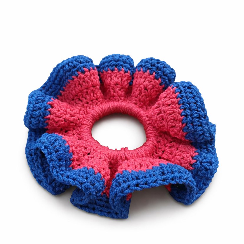Renkli el örgüsüyle yapılmış, fırfırlı kenarları ve rahat dokusuyla bohem ve retro tarzlara uygun kadın saç bandı.