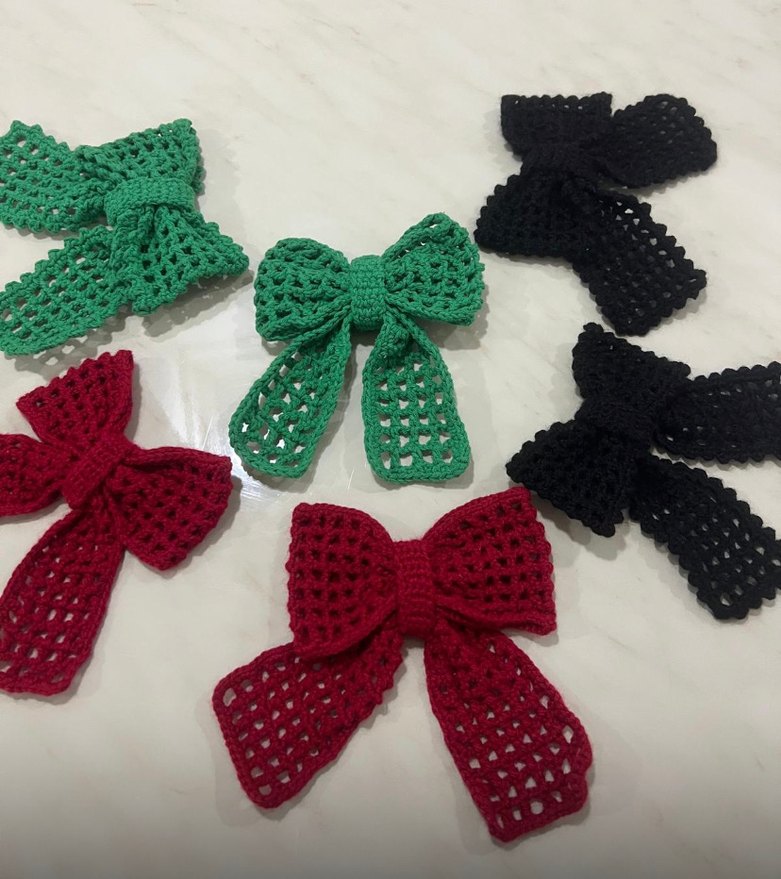 Yeşil, kırmızı ve siyah renklerde, vintage gotik tarzda, delikli örgü detaylı renkli örgü fiyonk saç aksesuarları.