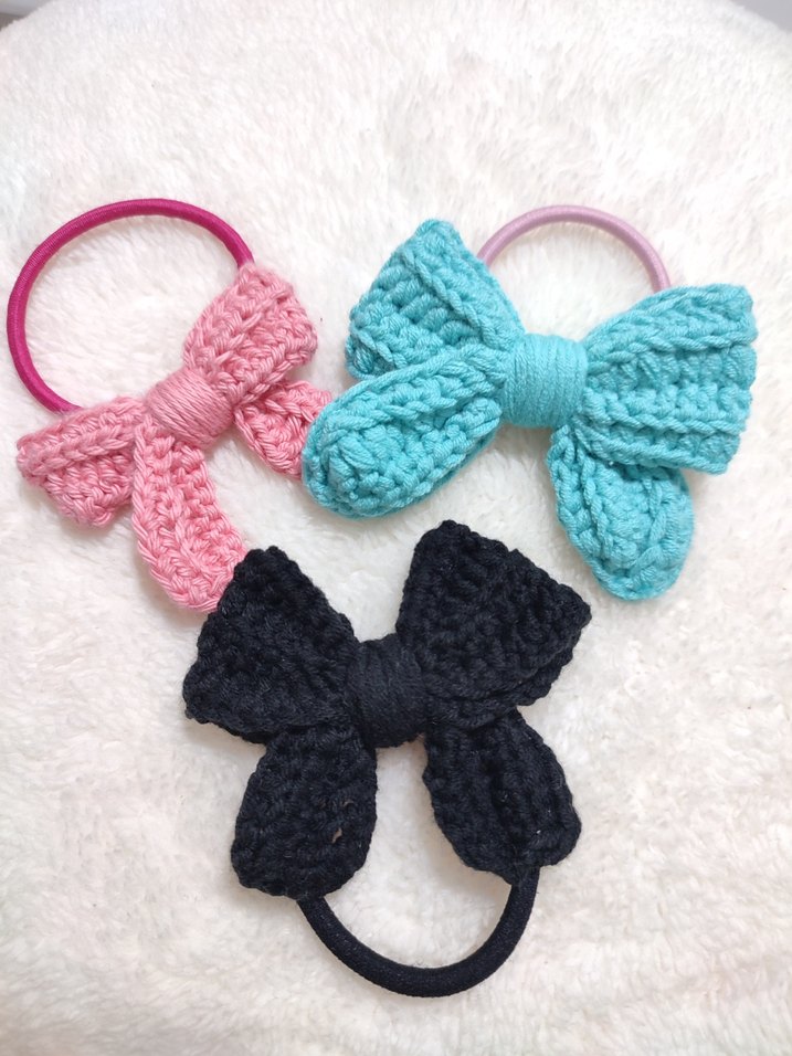 pembe, mavi ve siyah renklerde yumuşak dokulu, örgü fiyonk detaylı saç tokaları.