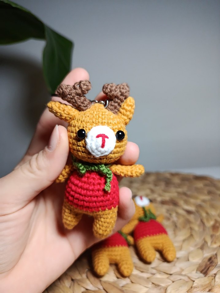 atkı detaylı kırmızı kıyafetli, örgü dokulu, renkli peluş geyik oyuncak. Siyah gözleri ve küçük kahverengi boynuzları vardır.
