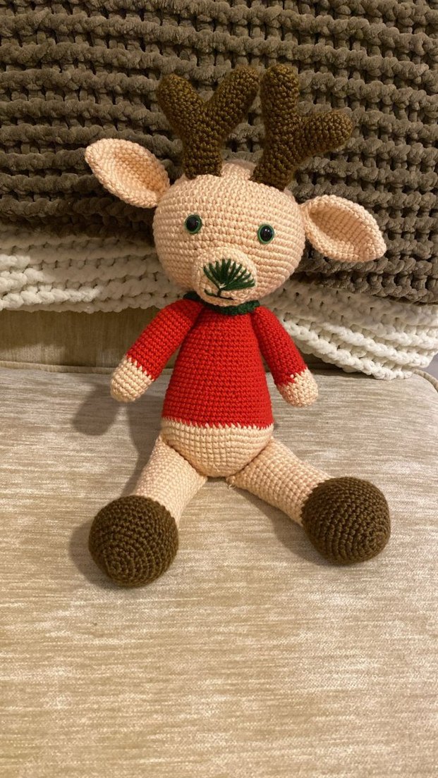 Kırmızı kazak giymiş, kahverengi örgü geyik şeklinde yumuşak peluş oyuncak. Renkli ve detaylı el yapımı.Amigurumi