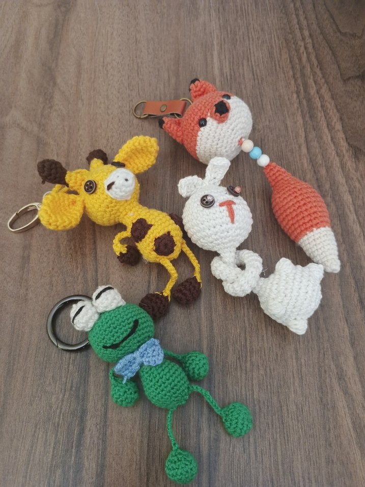 Renkli örgü tilki, zürafa, tavşan ve kurbağa figürlü anahtarlık seti, bohem tarzda rahat ve şık.Toplam fiyat