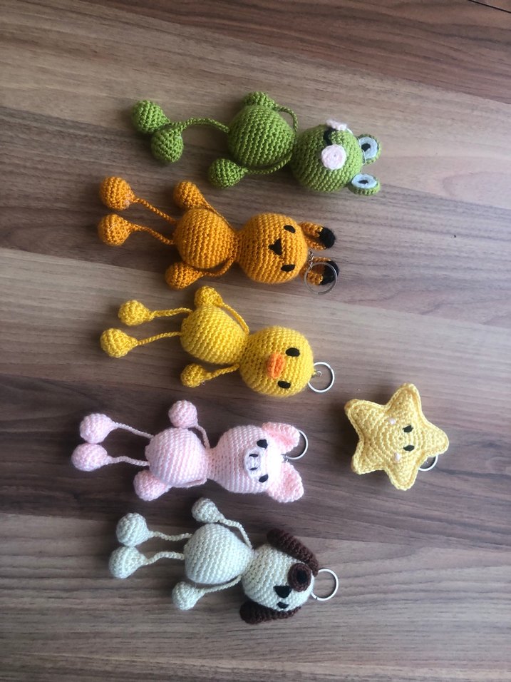Renkli örgüden yapılmış kurbağa, köpek, ayı, ördek ve yıldız figürlü anahtarlık . Her biri metal halka ile donatılmış.