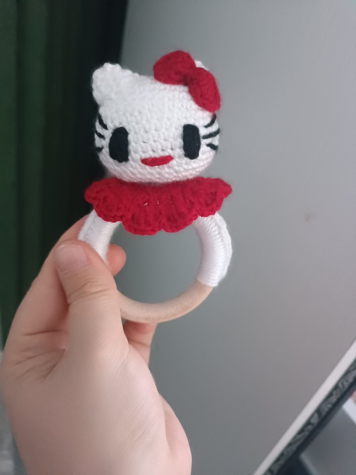 Renkli örgü Hello Kitty figürlü, ahşap saplı bebek diş kaşıyıcıdır.