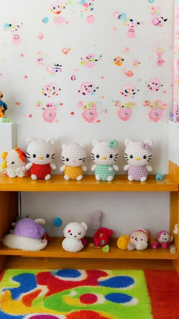 Renkli örgü Hello Kitty peluş oyuncaklar, ahşap rafta çeşitli pastel kıyafetlerle sergileniyor, etrafta küçük peluş oyuncaklar var.