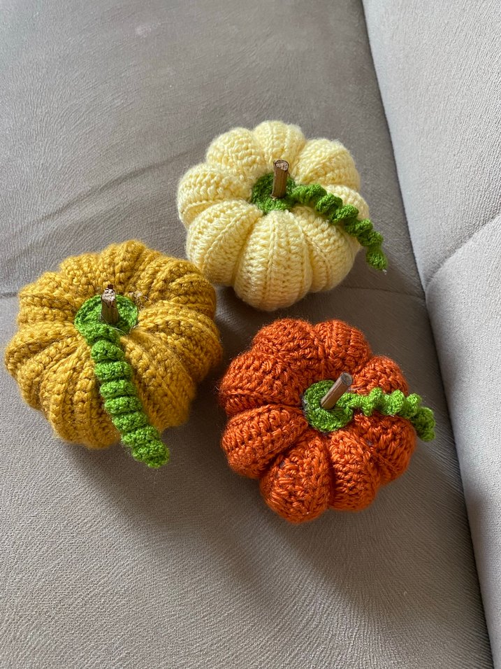 Sarı, krem ve turuncu renklerde yeşil saplı renkli örgü kabak dekorasyonları.