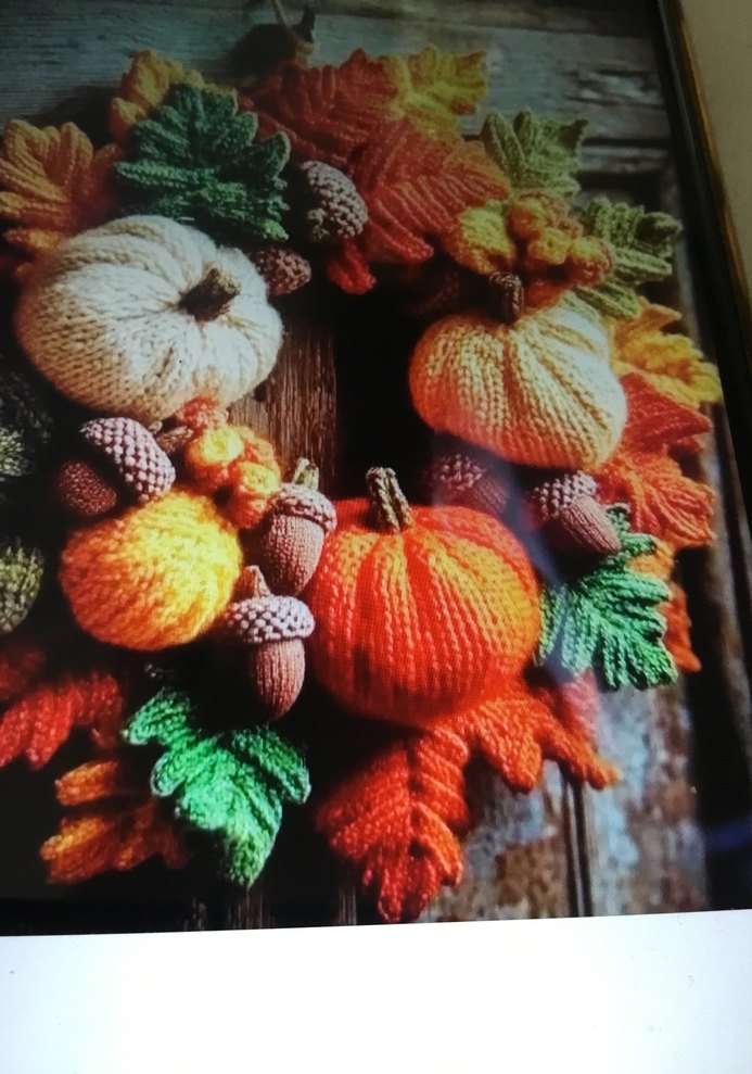 Canlı sonbahar renklerinde örgü kabaklar, palamutlar ve yapraklardan oluşan dekoratif bir süs.