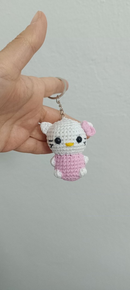 Renkli örgü malzemeden yapılmış, pembe ve beyaz tonlarında sevimli figürlü kadın anahtarlık.