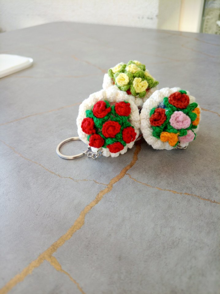 Renkli çiçek desenleriyle örgü tasarıma sahip, rahat ve bohem tarz için uygun anahtarlık.