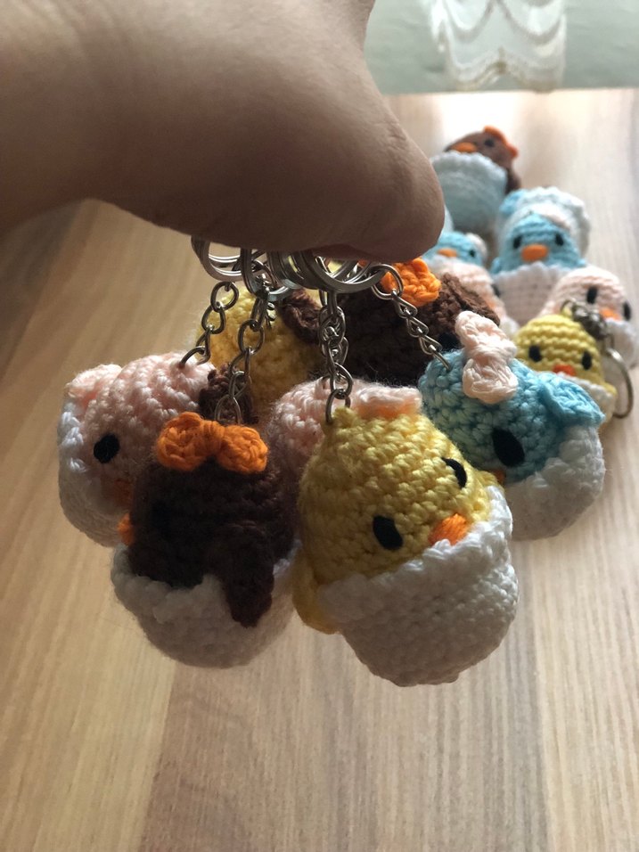 Renkli örgüden yapılmış, küçük hayvan figürlü kadın anahtarlıkları. Sade ve bohem tarzda, anahtarlarınıza hoş bir dokunuş katar.