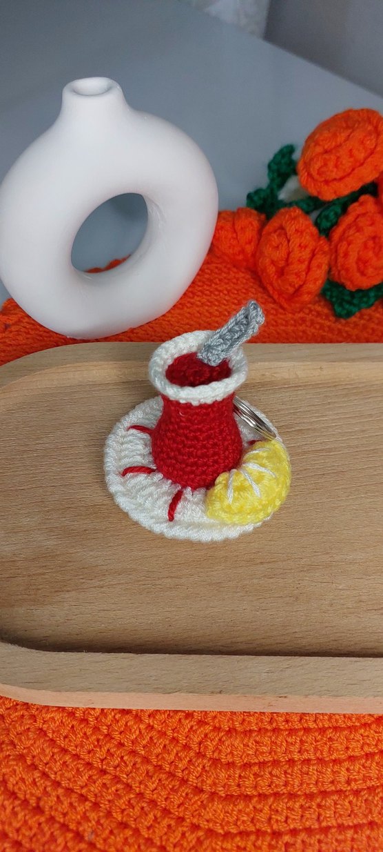 Renkli örgüden yapılmış, kırmızı fincan ve tabak ile limon dilimi detaylı, sıcak ve geleneksel tarzda kadın anahtarlık.