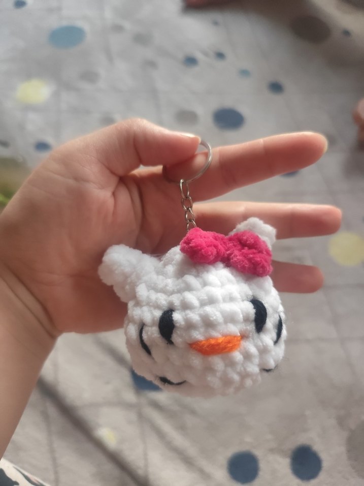 Renkli, örgü kadın anahtarlık; beyaz ve pembe fiyonk detaylarıyla bohem ve retro tarzına uygun, rahat bir tasarıma sahiptir.