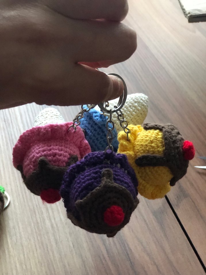 Renkli, örgü ve yumuşak dokulu dondurma tasarımlı anahtarlıklar. Sıcak ve rahat bir görünüm sunar.