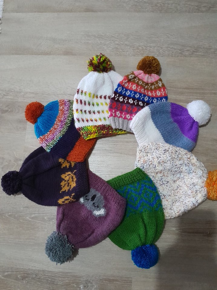 Renkli örgü ve ponponlu kadın bereleri, rahat ve bohem tarzda, canlı desenlere sahip.