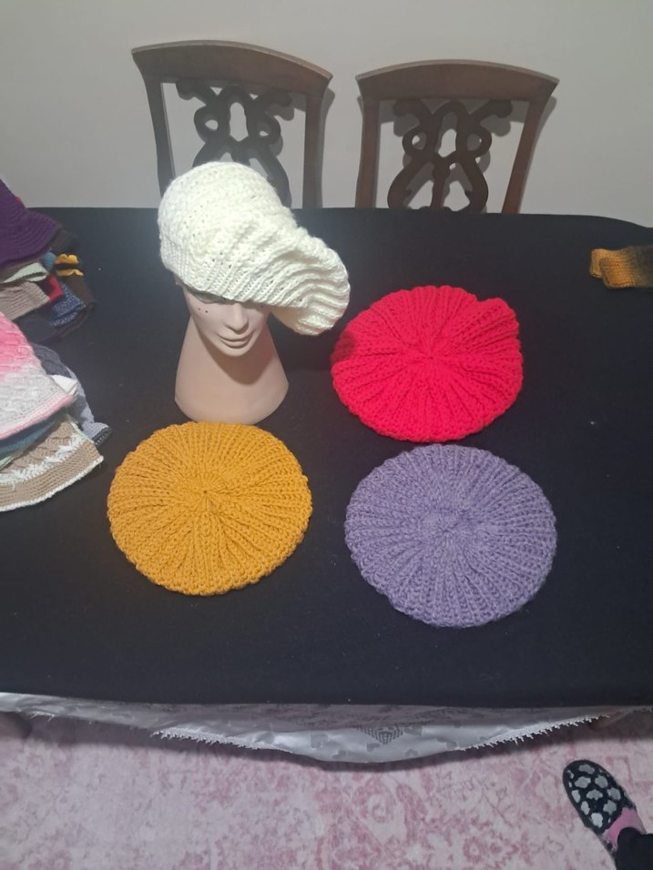 Renkli, örgü kadın bereleri, rahat ve bohem tarzda, karşı kültür havasında. Yumuşak örme kumaştan, retro görünüme uygun. El örgüsüdür kullanılmamıştır 4 farklı renk seçeneği vardır Pembe Beyaz Lila Sarı