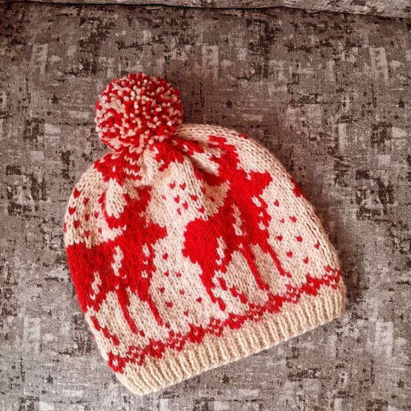Renkli örgü kadın bere, geyik desenleri ve ponponuyla bohem stilde, yumuşak örgü kumaştan sıcak tutar. ❄️