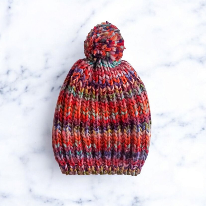 Renkli örgü kadın bere, üstte ponpon detayıyla bohem ve retro tarzı yansıtır. Yumuşak akrilik dokulu. F&F marka, İngiltere için üretilmiş. Tek beden (one size). Temiz ve defosuz.