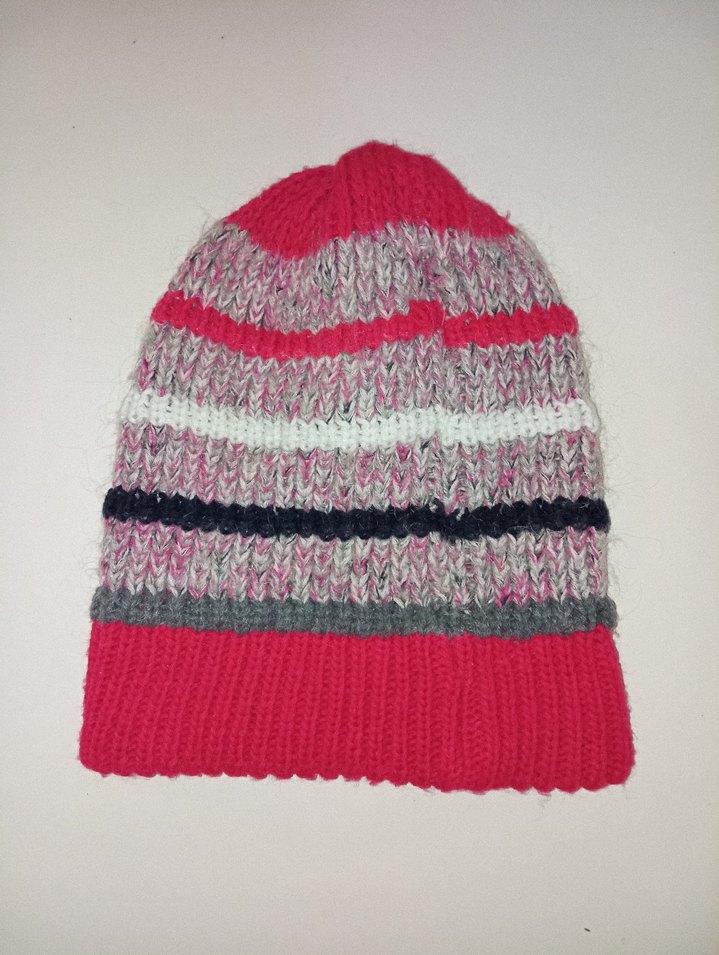 Pembe tabanlı, renkli çizgili örgü kadın bere, rahat ve bohem tarz sunar.