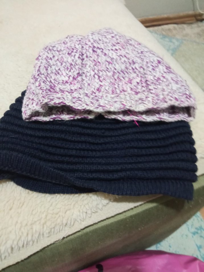 2 adet Renkli ve örgü tasarımlı kadın bere, rahat dokusuyla dikkat çekiyor. Mor ve canlı renklerin birleşimiyle trend bir stil sunar.
