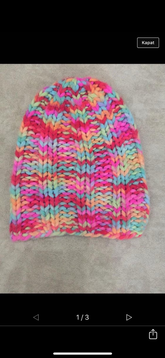 Renkli, kalın örgü dokusuyla bohem ve retro tarzlara uygun, rahat bir kadın bere.