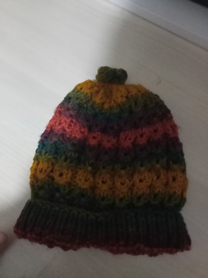 Kadınlar için örgü, koyu renkli çok renkli bere. Dokulu desen ve küçük top detayına sahip, rahat ve bohem tarzda.