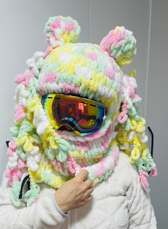 Kadınlar için örgü, pastel çok renkli iplikten yapılmış bere. Baş ve boynu kapatan, büyük örgü halkalar ve iki ponpon içerir. Avant-garde tarzı ile dikkat çeker.