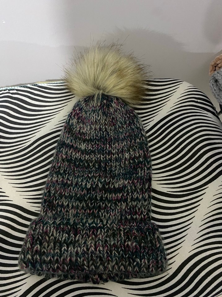 Renkli örgü ve gri tonlarda, üstünde yumuşak ponpon bulunan kadın bere. Rahat ve bohem, retro tarzı yansıtıyor.