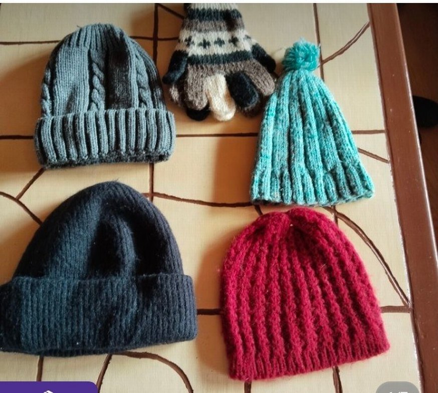 Çeşitli renk ve desenlerde beş adet örgü kadın bere seti. Rahat ve bohem tarzı, soğuk havalar için renkli seçenekler sunar.