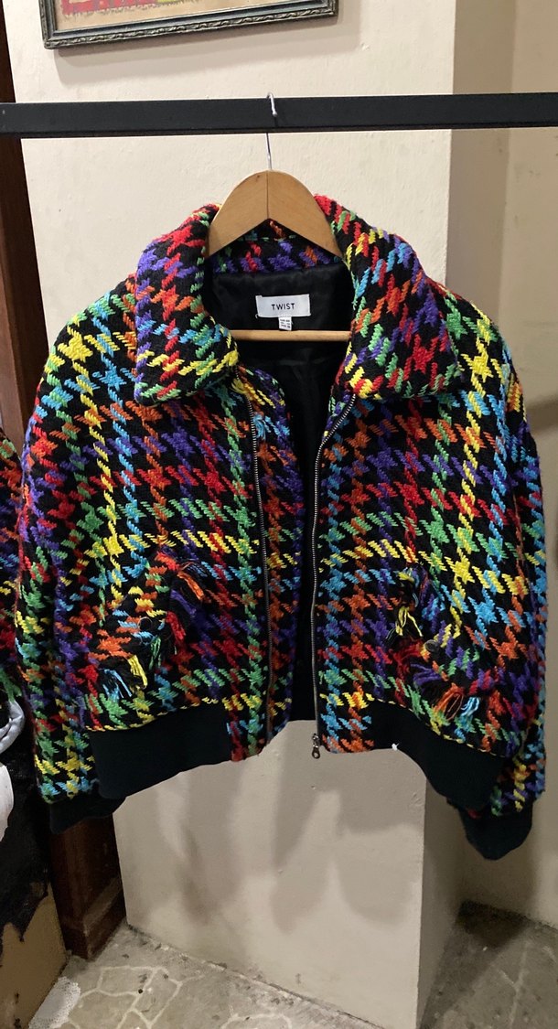 Renkli örgü kadın ceket, gevşek kesim, uzun kollu ve yakalıdır. Midi boyda, yumuşak tekstil malzemeden, sokak modasına uygun bir tasarımdır.