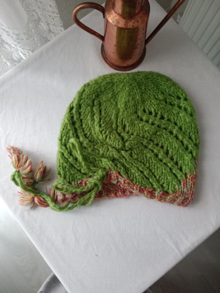 Renkli ve örgü dokusuyla rahat, bohem tarzda kadın bere. Canlı yeşil ve çok renkli detaylar içerir.