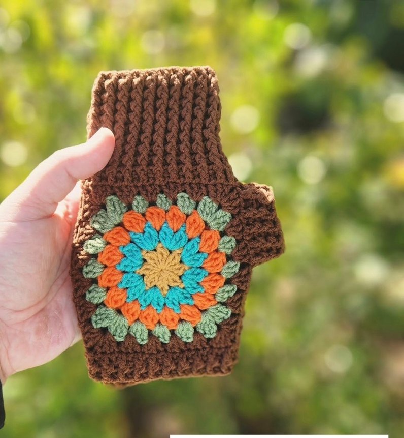 Kahverengi örgü eldiven, renkli bohem tarzda dairesel desen içerir. Kaliteli koton iplerle örülmektedir