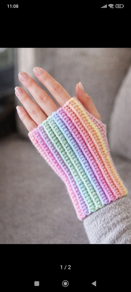 Pastel renklerde gökkuşağı çizgili, örgü kadın eldiveni. Rahat ve bohem tarzda, retro havası sunar. el örgüsü