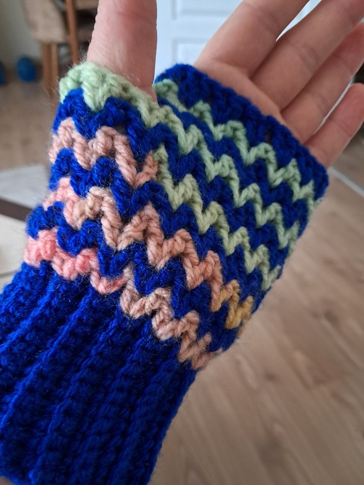 Renkli örgü kadın eldiveni, bohem tarzıyla rahat ve retro bir görünüm sunar.