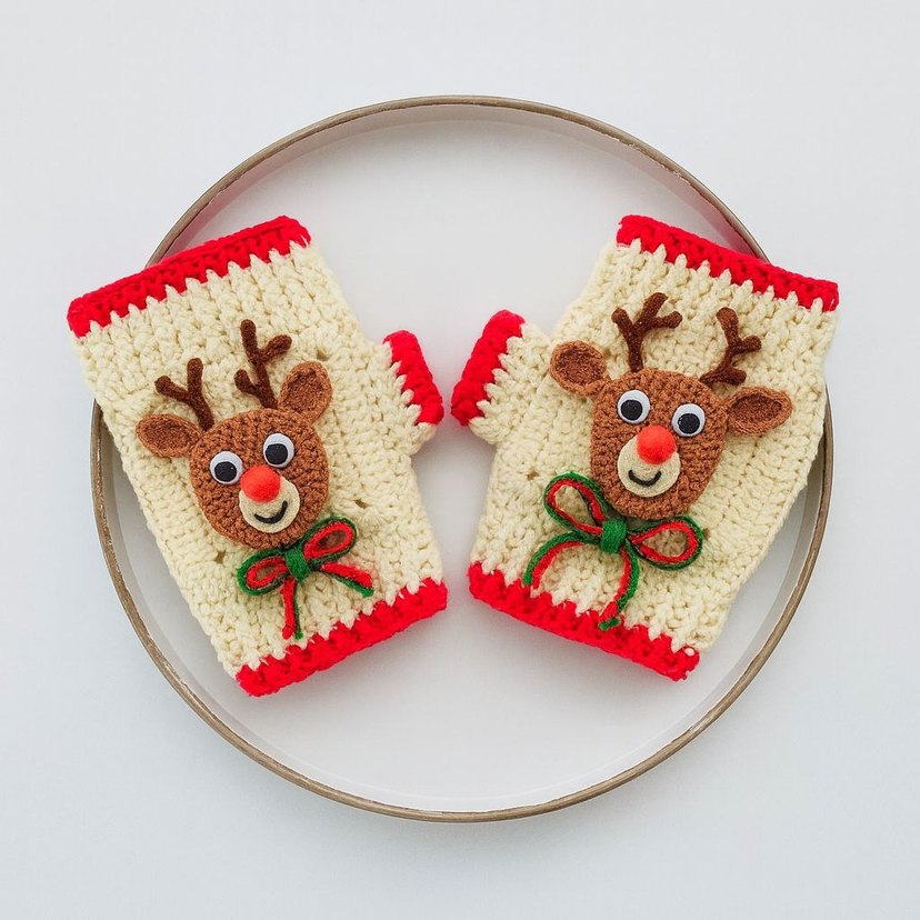 Renkli, örgü kadın eldivenleri; geyik süslemeleri ve kırmızı kenar detaylarıyla rahat, bohem tarzda. Yarım parmaklı tasarım en güzel yeni yıl hediyesi