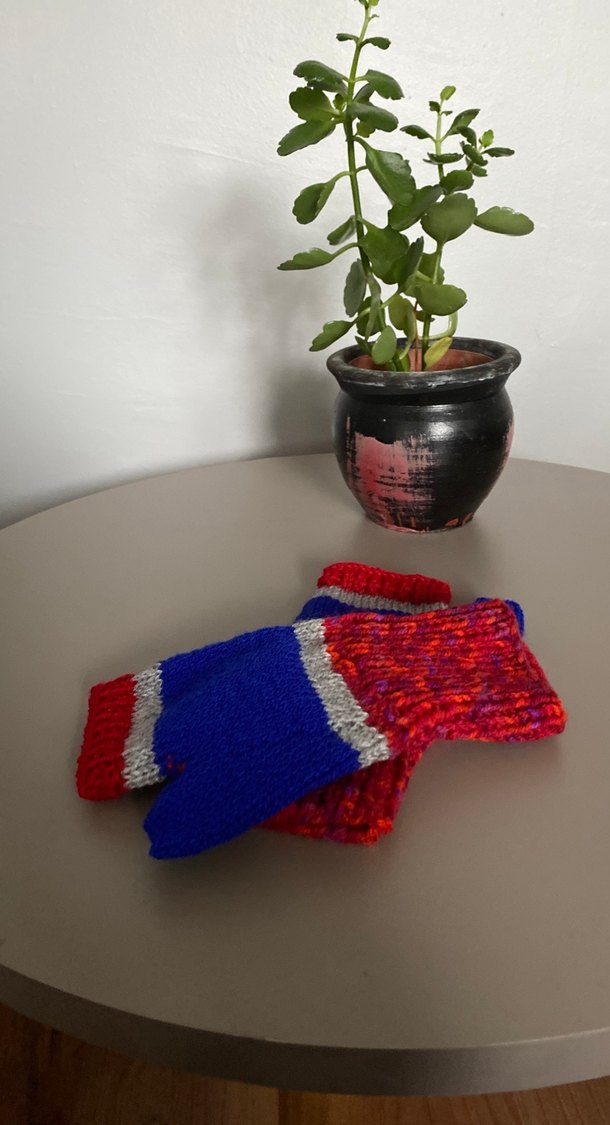 Renkli kırmızı, mavi ve gri tonlarında, rahat ve bohem tarzda örgü kadın eldivenleri.