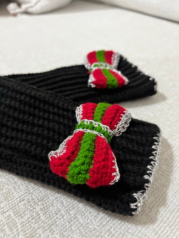 Renkli kırmızı ve yeşil fiyonk detaylı siyah örgü kadın eldivenleri, rahat ve gotik tarzı bir araya getirir. Moda tutkunları için ideal.