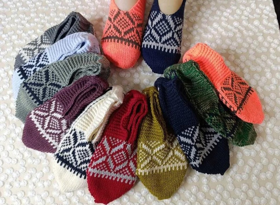 Renkli, desenli örgü kadın ev terlikleri, düz tabanlı ve günlük kullanım için rahat. Bohem ve retro tarzlara uygun. 20 adet fiyatidir