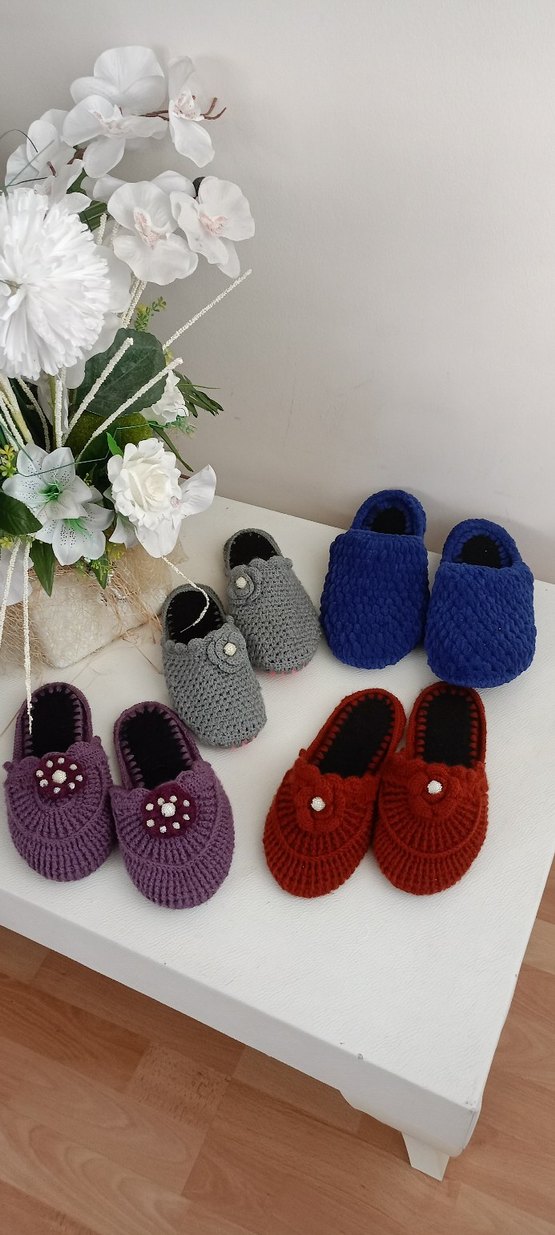 Renkli, örgü kadın ev terlikleri, sade ve rahat tasarıma sahip, günlük kullanıma uygun. Klasik stiletto topuklu ve desensiz model.