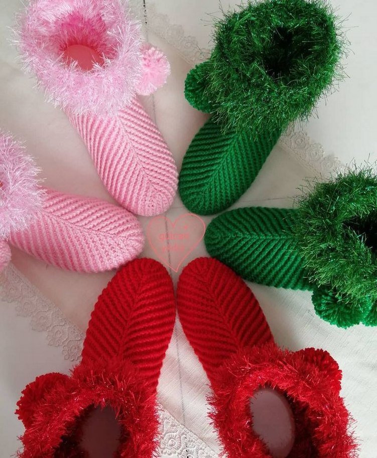 Yumuşak örgü kumaştan yapılmış, nakış detaylı renkli kadın ev terlikleri. Pembe, yeşil ve kırmızı renk seçenekleriyle rahat bir tasarım sunar.