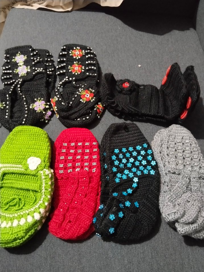 Çeşitli desenlere sahip, stiletto topuklu renkli örgü kadın ev terlikleri. Günlük kullanım için rahat, sıcak ve avangart tarzda.